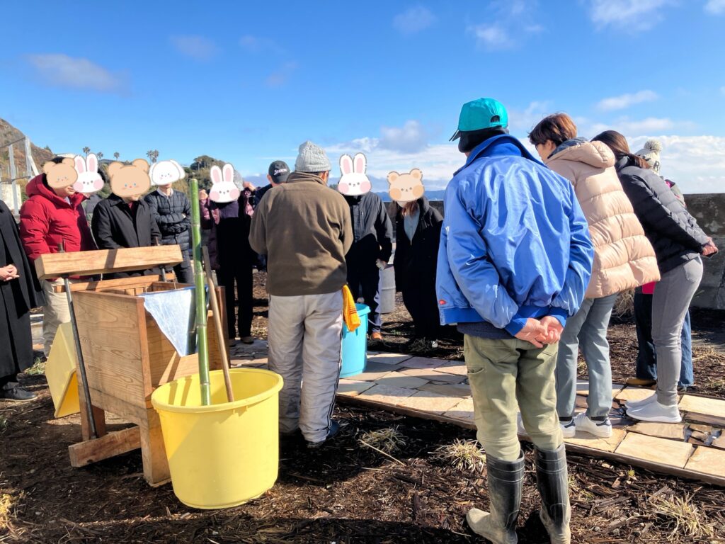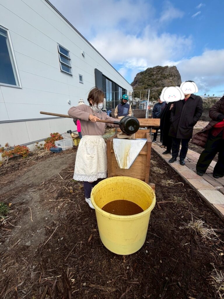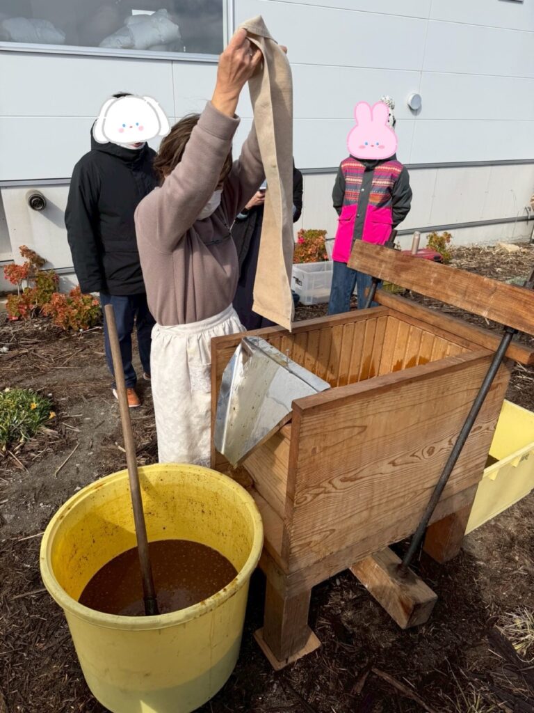 2月8日 オルビスで一年大切に育てた手造り醤油搾りイベントを行いました。前日の雪模様で参加出来ない方もいらっしゃいましたが総勢16名の方々の参加で開催しました。